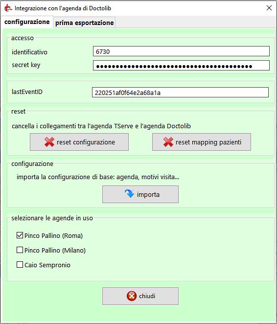 - configurazione: importa la prima configurazione di Doctolib: l'identificativo della agenda (o delle agende nel caso di una medicina di rete o di gruppo) e l'elenco dei motivi di visita. L'allineamento della configurazione verrà fatto una volta al giorno alla apertura della agenda di TServe.