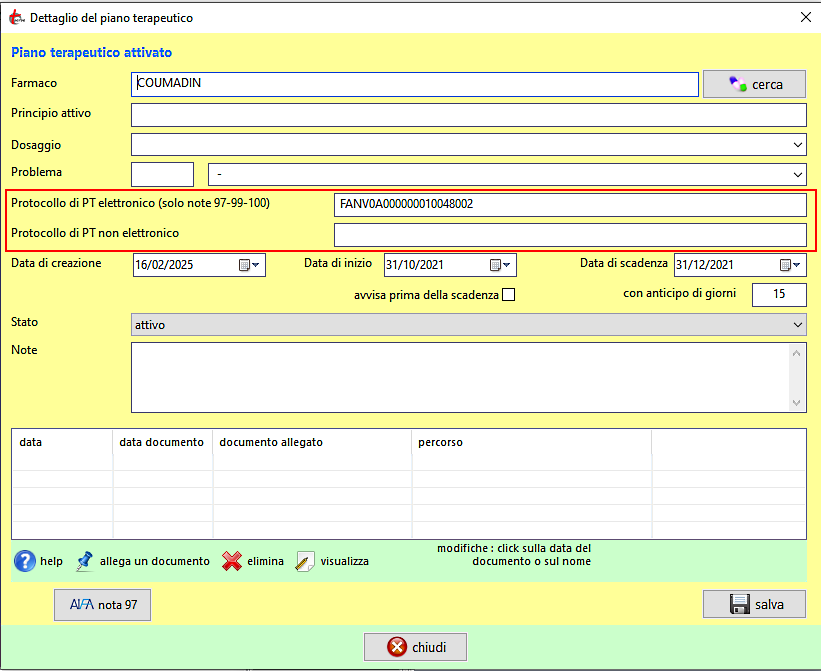 ed è possibile inserire le date di inizio e fine del PT in modo da evitare l'avviso ad ogni prescrizione ed avere invere la notifica in pprossimità della scadenza. Se il PT prevede un protocollo di piano elettronico si può inserire qui e sarà inserito sia nella ricetta elettronica che nel relativo promemoria.