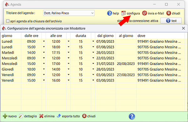 Per configurare gli orari di ricevimento si apre l'agenda poi click su "configura":