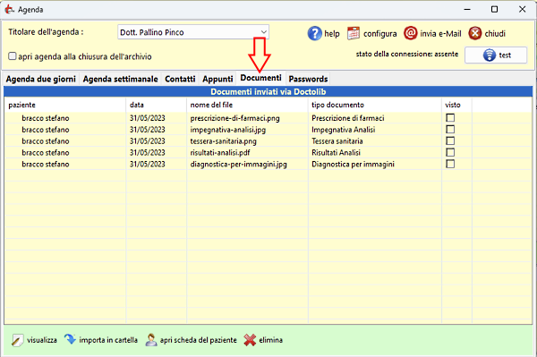 I documenti importati sono visibili nella finestra dell'agenda nella scheda "Documenti"