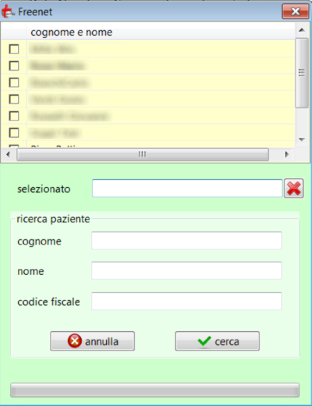 Inserendo poi il cognome del paziente (almeno 3 caratteri) eventualmente con il nome oppure il codice fiscale si arriva all'elenco dei pazienti che compare in una nuova finestra.