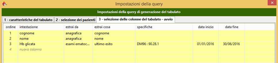Eseguita la selezione dei pazienti occorre selezionare i dati da inserire nel tabulato :
