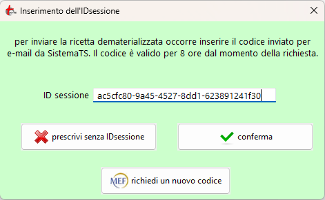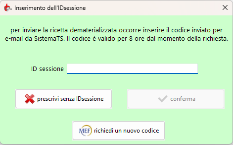 Dopo l'inserimento dell'IDsessione click sul tasto conferma (si attiva dopo l'inserimento dell'IDsessione se conforme) per memorizzarlo e continuare la prescrizione.