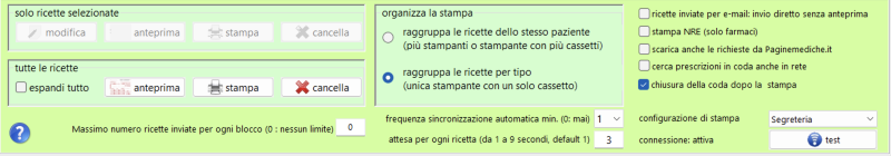 - massimo numero di ricette inviate: il numero massimo di ricette da inviare per ogni operazione: utile in caso di connessioni lente e in ogni caso nella stampa in ambiente SISS. Le ricette da firmare saranno divise in tanti blocchi ognuno dei quali avrà al massimo il numero di ricette indicato. In SISS si consiglia di impostare al massimo 40 ricette per ogni blocco.